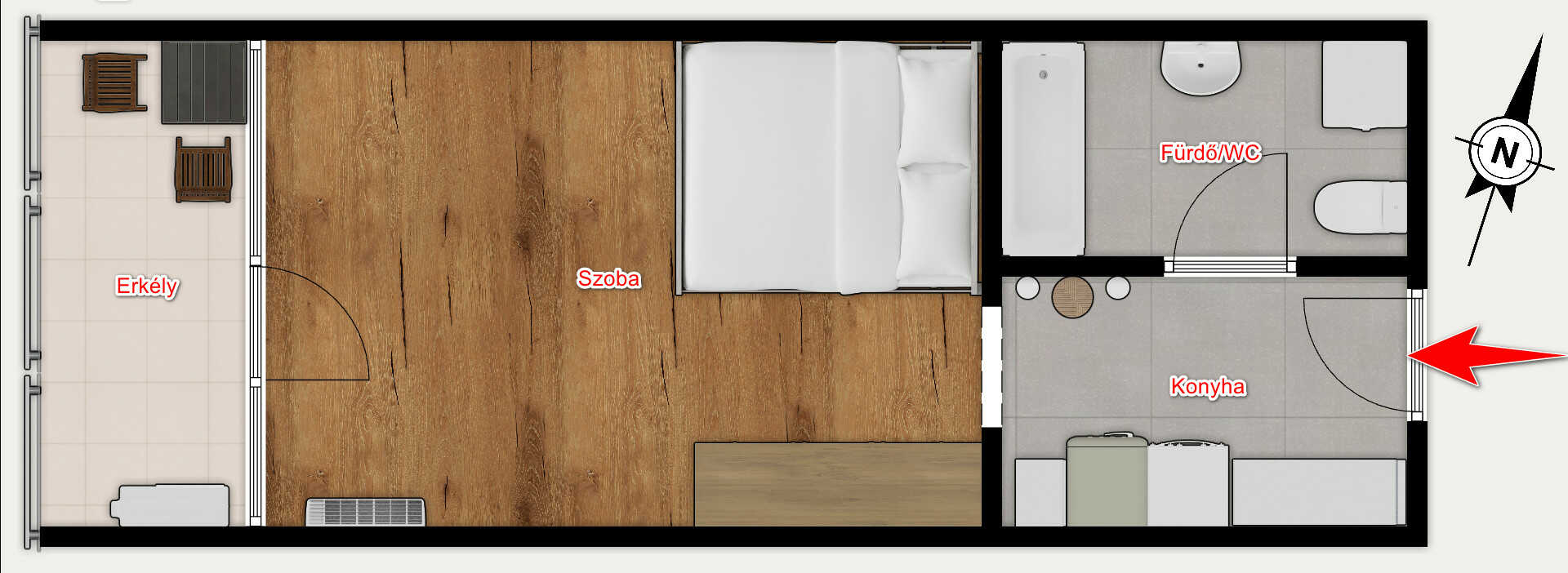• 29 m2 fűtött alapterület: szoba, konyha/előtér, fürdő/wc;